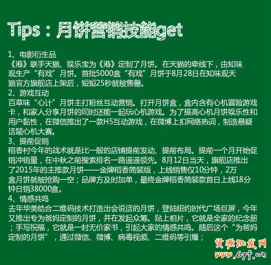 根據(jù)往年月餅售賣的高峰期是在中秋前半個(gè)月推斷,天貓聯(lián)合《港囧》片方在9月13日舉辦了《港囧》電影衍生品經(jīng)濟(jì)發(fā)布會(huì),推出6只裝禮盒裝月餅。為這一階段的營(yíng)銷造勢(shì),主演包貝爾在北京直播賣月餅,導(dǎo)演徐崢在做關(guān)于《港囧》娛樂(lè)節(jié)目通告的時(shí)候,都會(huì)帶上這款月餅,不只是推薦電影也推薦月餅。