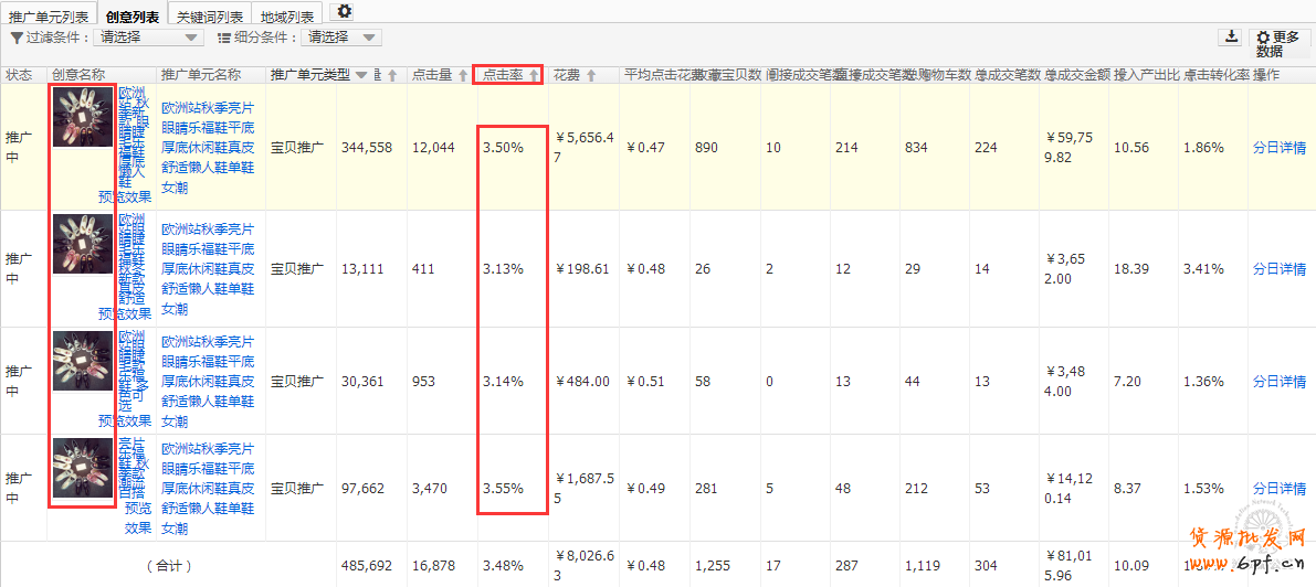 1.開啟投放四個創意測試寶貝推廣圖點擊率: