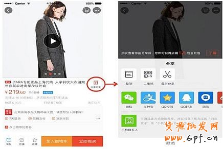 賣家只要在預熱前期的預熱任務中設置了分享有禮活動,被設置了活動的商品的詳情頁面中的分享入口處就會增加一個“分享有禮”的紅包樣式,可以吸引到消費者去做分享。消費者可以將寶貝分享到微信、支付寶、QQ等社交媒體中,為我們的店鋪寶貝引流。