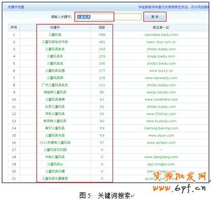 在打開的“百度指數(shù)分析”頁面中,輸入目標關鍵詞“兒童玩具”,完成后單擊右側的“查詢”按鈕。你可以發(fā)現(xiàn)這里出現(xiàn)了很多相關的關鍵詞,“指數(shù)”顯示的數(shù)字就是百度指