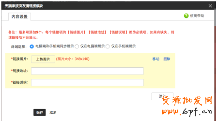 添加圖片+url,必須上傳3張圖片,無線和pc需要分別上傳,共計6張。url必須是通過審核的寶貝,且在架有庫存狀態,否則整個區域無法展示