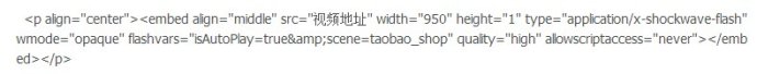 視頻地址可以自己更換,推薦使用youku的,高度為一個像素,確保其可以隱形。自動播放無廣告,親測隱形加載幾乎不占用頁面加載速度,你可以找心儀歌曲的mv,有能力的用軟件處理幾個視頻,把歌曲銜接起來在上傳獲得鏈接,就可以實現不同歌曲輪流播放的效果啦~或者您可以自己錄一段視頻,把自己想說的話,店鋪的活動及特色等加進去做成類似掌柜說,空間喊麥的效果。以上代碼無循環播放功能,需要的親可自行添加。