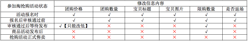 為了維護(hù)淘搶購平臺的經(jīng)營秩序,更好地提升淘搶購商家的服務(wù)質(zhì)量,保障淘搶購消費者的相關(guān)權(quán)益,淘搶購業(yè)務(wù)對報名過程中信息修改進(jìn)行規(guī)范。在報名、審核、排期、發(fā)布、活動各環(huán)節(jié)修改項以下列表格為準(zhǔn):