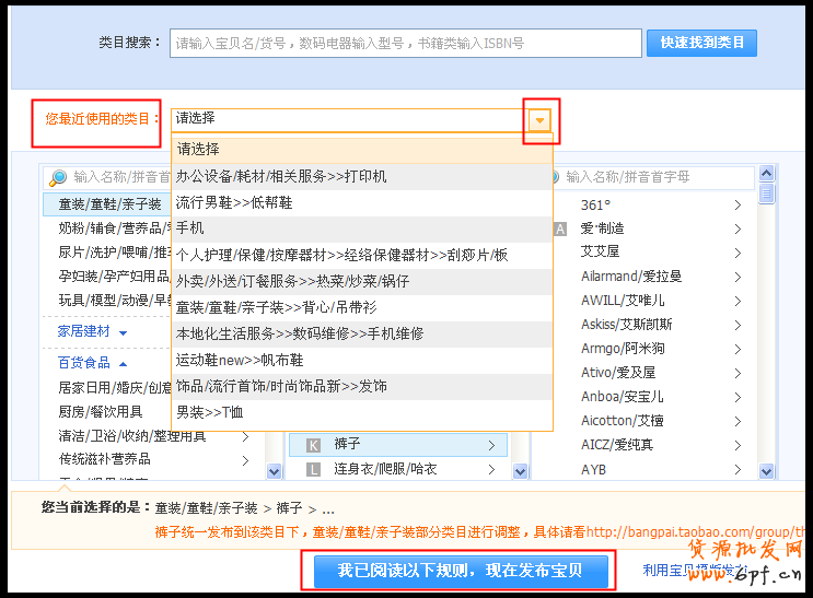 您也可以從一級類目開始,往下選擇類目。有一些比較容易混淆或者選擇錯誤的類目下,有該類目的一些注釋和發布的建議和提醒,請注意。例: