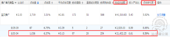 以上為過去30天主推寶貝搜索受眾投放的數(shù)據(jù)情況,由于臨近雙十一,轉(zhuǎn)化會呈現(xiàn)下滑,過去30天的數(shù)據(jù)更具代表性,可以看出”女30-34”人群的投放,通過年齡及客單價的圈定,該人群促進(jìn)的成交金額多且轉(zhuǎn)化率較高,可以通過人群的溢價比例調(diào)整來提升該人群的流量,人群的圈定有利于提升流量的精準(zhǔn)性來促進(jìn)轉(zhuǎn)化。