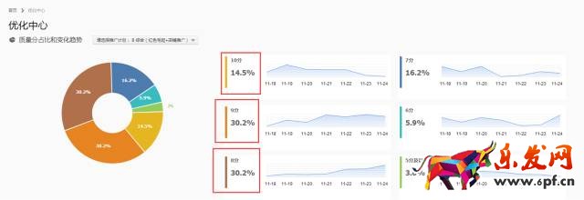 這里有個優化中心,出來大概有個一年多了。但是大家可能是沒有太注意,那我們要怎么才能知道我們的直通車是否是健康的呢,下面這張圖上有六個數據,我圈出來的3個分別是10分,9分,8分。注意這個知道占比的問題,如果在坐的老板沒有時間去查看直通車收益,要盯促員工工作效率,查看10分的占比多少,如果10分詞和9分8分詞的比重同期在往下滑的話。5分和7分都在提升,那就說明這個sku很久沒有人去打理管理了。7分、8分、9分比重加起來是否超過50%,如果超過,那就說明這個計劃是比較健康的。