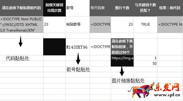 7. 只需要輸入款號和圖片鏈接,也就是插入所有圖片信息,如下圖圖片(五),在款號后面的“新代碼”處,粘貼出新模版的代碼,新的商品詳情頁就完成了一個初步的原屬雛形;