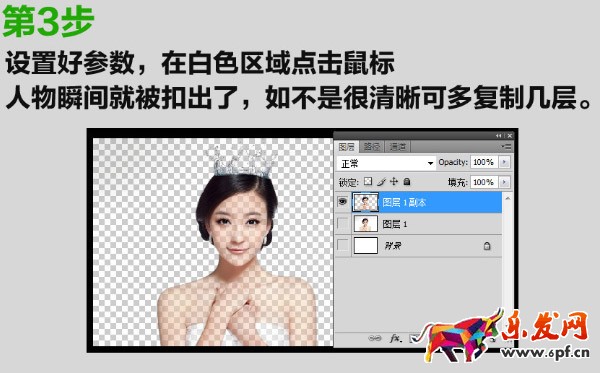 三、如下圖,隱藏背景和圖層1(勾走圖層前的“眼睛”),然后檫掉白色區(qū)域,大面積就一筆檫掉,小面積就一點一點檫掉,細(xì)活就慢慢來,人物很快就摳出來。