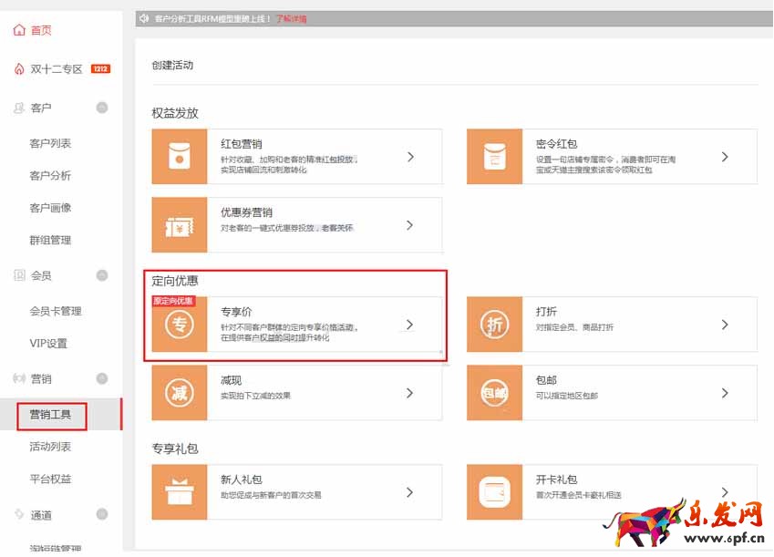 看完數據后,是不是有一種迫不及待的想操作的沖動,要怎樣操作呢? 首先,我們可以看到下圖,在營銷工具里面,有很多的活動分類,例如權益發放的紅包營銷、密令紅包,又或者定向優惠的專享價、打折、減現等等,下面針對專享價進行操作。