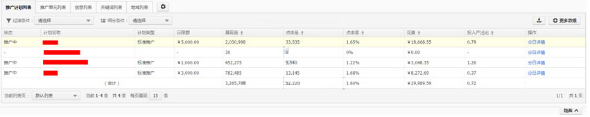 由上圖(由于尺寸與講解需要,此圖片為直通車報表下半部分)可以了解到,直通車報表下半部分能更明確的了解到,各個不同計劃中的展現量,點擊量,花費,投產與其他數據(展示數據根據需要可調整),直通車報表里共有五個列表,分別為:推廣計劃列表,推廣單元列表,創意列表,關鍵詞列表,地域列表。