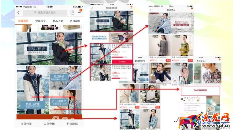 但是很多服裝店鋪SKU過多,如果使用大圖或多圖模塊進行寶貝展示的話,勢必需要大量的篇幅,而無線端由于屏幕的局限和用戶的習(xí)慣。我們不可能將我們主要去推的寶貝全部放在頁面中重要的位置。那么,這時候我們有沒有一種方法能夠在有限的位置盡量將我們更多的主推單品展現(xiàn)的方法呢?當然有,這就是自定義頁面!縱觀一些服裝大店,基本上都會大量的使用自定義頁面。PS:甚至是分類頁都會采用自定義頁面哦~!!