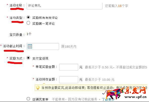 這里需要說的一點(diǎn)是,在選擇活動(dòng)類型的時(shí)候,獎(jiǎng)勵(lì)第一筆評(píng)論不難理解,那么獎(jiǎng)勵(lì)所有有效評(píng)論是什么意思呢?根據(jù)多年的經(jīng)驗(yàn),有效評(píng)論是指三十字以上的評(píng)價(jià)、緊扣寶貝屬性內(nèi)容(尺碼、顏色)寫的評(píng)論哦,是淘寶網(wǎng)系統(tǒng)自動(dòng)識(shí)別認(rèn)定的,可以是好評(píng)也可以是差評(píng)。