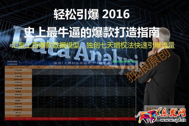 表格簡單來說是一個爆款打造指南,誕生于15年7月份,12月份做了一些大的數(shù)據(jù)調(diào)整更新為2.0版本試用于16年淘寶新玩法(也就是文章的第一張 圖片,上圖是1.0版本),表格是綜合匯聚上百個爆款數(shù)據(jù),聚集幾十個類目爆款模型而成,獨(dú)創(chuàng)七天增權(quán)法快速引爆新品流量,反過來說就是,告訴你一個真正 的爆款長什么樣數(shù)據(jù),比如轉(zhuǎn)化率每天應(yīng)該怎么引導(dǎo),流量銷量等等各個維度指標(biāo)!