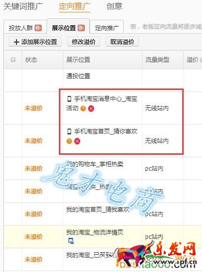 手機(jī)端定向的操作:開(kāi)啟定向計(jì)劃,測(cè)試初期最好單獨(dú)建立計(jì)劃,與關(guān)鍵詞計(jì)劃互不影響,針對(duì)淘寶活動(dòng)和猜你喜歡兩個(gè)展位進(jìn)行溢價(jià)投放。通過(guò)一段時(shí)間的投放反饋的數(shù)據(jù)進(jìn)行調(diào)整分析,也許會(huì)有意想不到的效果。如果你投放的沒(méi)有流量,從以下幾個(gè)方面找原因: