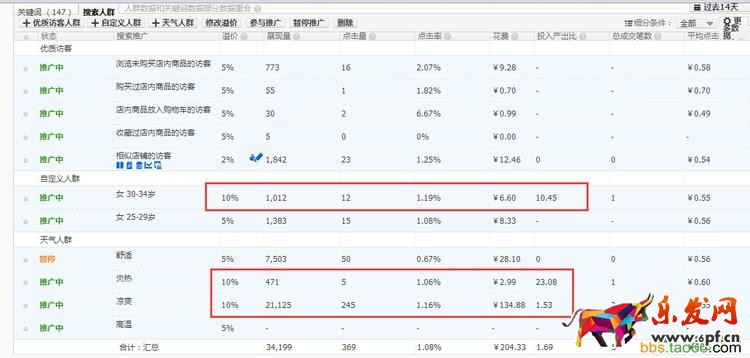 分析:多渠道進(jìn)行引流,開啟訪客人群,自定義人群,天氣人群進(jìn)行測(cè)試,測(cè)試符合賬戶寶貝推廣的相應(yīng)人群,并根據(jù)數(shù)據(jù)反饋情況加以調(diào)整,為寶貝多方面引流測(cè)試。