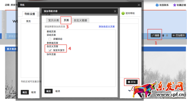 ③點擊”添加“彈出框選擇”頁面“,勾選”51大促店鋪承接頁”,點擊確定即可