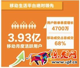 2015年12月31日,阿里巴巴發布的2016財年第三財季財報顯示。數據顯示,阿里的移動月度活躍用戶這一季度達到3.93億,占整個中國手機網民數量的60%;其中,第三季單季凈增長4700萬人;交易額方面,移動端交易額占比整體的68%,其中單個移動用戶價值更是突破100元。