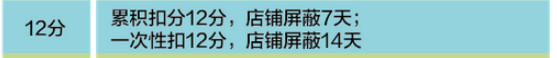 12分:累積扣分12分,店鋪屏蔽7天,一次性扣12分,店鋪屏蔽14天