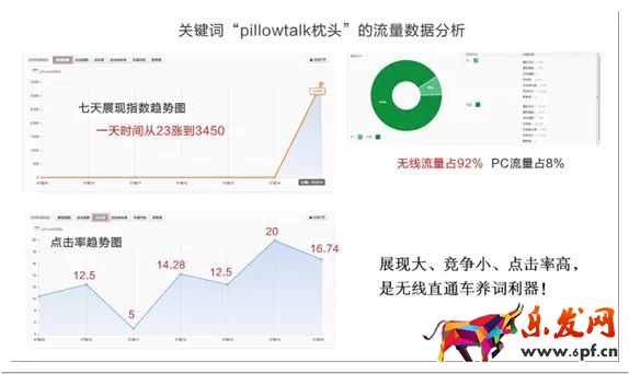 當確定候選詞后,下一步工作是確定其有無足夠的展現量,并且必須是無線端展現量。這依賴直通車后臺的新版流量解析,它能告訴你任何競價詞的詳細數據,是決策選詞必備工具。