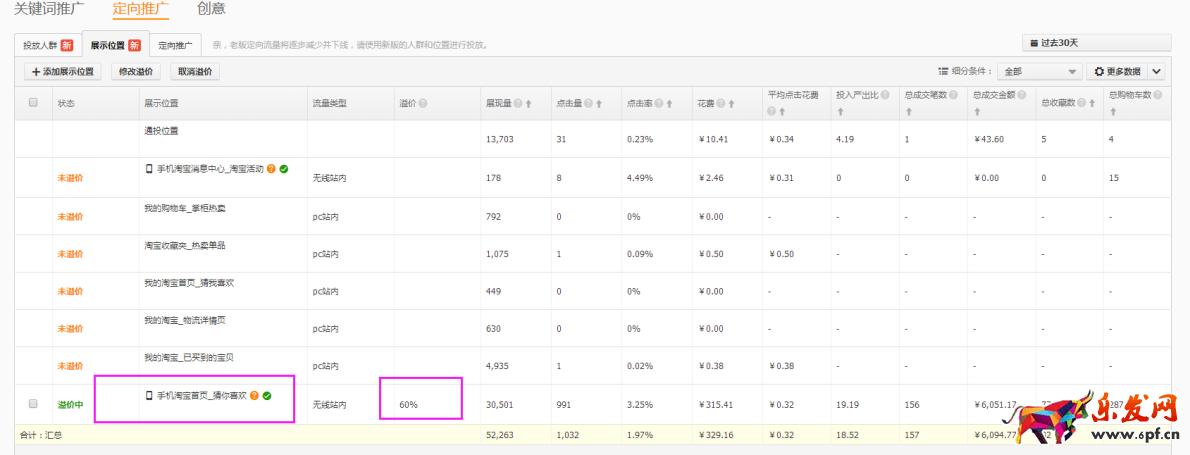 定向也是流量來源的重要端口。在前期測試階段可以低價格打開定向以及訪客定向,觀察流量的多寡已經(jīng)收藏加購情況,若收藏加購比較樂觀,考慮提高出價引進更多流量觀察轉(zhuǎn)化。同時,購物意圖定向也可以低溢價比例打開測試,看流量以及轉(zhuǎn)化情況。定向的各個展示位置放開后,更有利于我們觀察各個展示位置的流量轉(zhuǎn)化情況,“手機淘寶首頁—猜你喜歡”這個端口的流量一般比較優(yōu)質(zhì),在該直通車上也是轉(zhuǎn)化較好,因此可以高比例的溢價,獲取更多的流量。