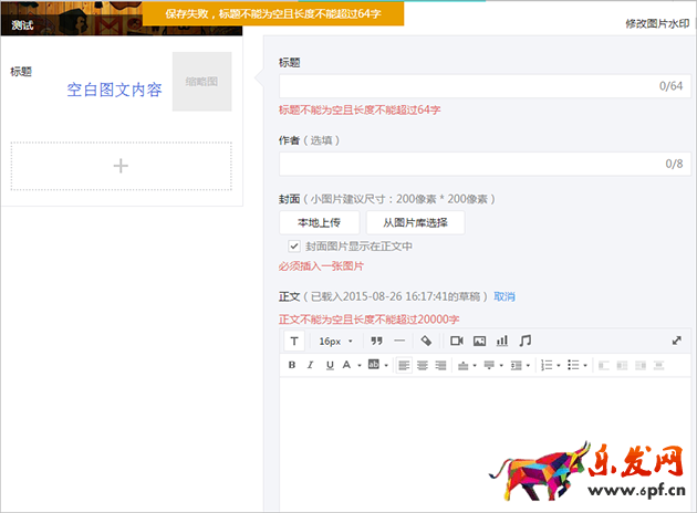 大圖片建議尺寸:900 * 500像素,上傳后圖片會自動壓縮為寬640像素(高會壓縮為對應比例)的縮略圖,在手機端可點擊查看原圖;二、提示“保存失敗,正文不能為空且長度不能超過20000字”