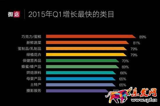 此外,微店還統計出Q1季度增長最快的類目,依次為巧克力/蛋糕,新鮮蔬菜,蛋制品/乳制品,綠植花卉,保健營養品等。