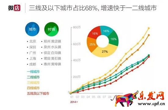 出人意料的是,在城市的分布上看,微商人群集中在三線及以下城市,占比達68%,增速快于一二線城市。
