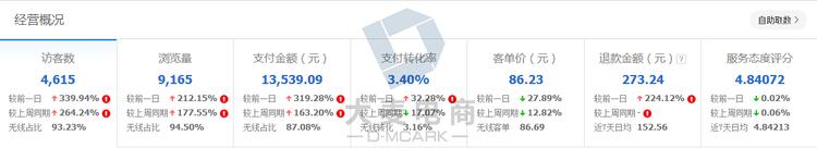 整個店鋪的產(chǎn)品單價是比較集中在80元,在零食類目中,這個價格段相對是比較難上活動的,如果要上活動,產(chǎn)品的價格要降低,但是生成成本不允許,所以我們針對兩到三款潛力款,專門增加一個簡易包裝,并將重量減少,從而降低成本。這兩款的簡易包裝寶貝作為我們的活動款,利用活動款,進行符合要求的官方活動報名。活動通過報名之后,活動款與店鋪其他寶貝進行搭配,充分利用活動帶來的流量,提高店鋪的轉(zhuǎn)化和客單價。下面的數(shù)據(jù)是簡易包裝寶貝進行天天特價活動,活動當天店鋪總的流量和營業(yè)額比活動前一天是上升了320%。只要活動規(guī)劃好,小活動也可以帶來意想不到的效果。