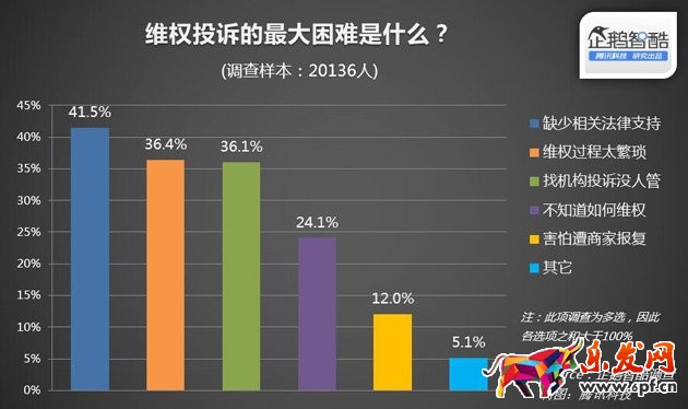 在關于維權困惑的調查中,四成網民選擇“缺少相關法律了解”,覺得“維權過程太繁瑣”的意見排名第二位。與之相對的是,“擔憂商家報復”占比僅為12%——網民對于維權還是很勇敢的!
