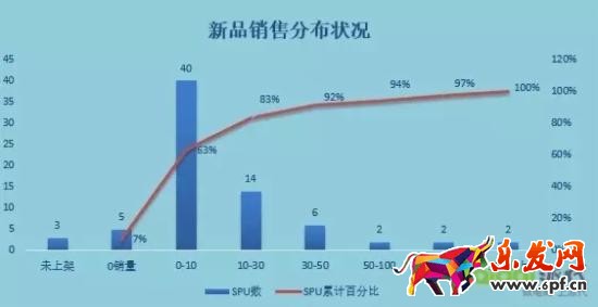 很多時候,我們往往顧著上新,開發新品或者延伸品類沖擊業績,但是卻沒有嚴謹的計劃而導致新品淪為庫存,從上面月銷量30以內的占到了83%,而0-10銷量以內的占了63%。