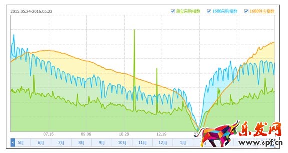 然后我們看一下供應指數,在15年的5月份的時候,供應指數在1688采購指數的下面,也就是說,這基本意味著市場供不應求,所以在6月份開始就上來了;注意,更為關鍵的是,你看一下16年的5月份,1688供應指數明顯的到了采購指數的上面,也就是供過于求。這意味著什么?這基本意味著來年的5月份的時候很有可能繼續是供不應求,所以如果明年你想切入這個連衣裙的市場,你的準備最好在四五月份之前。