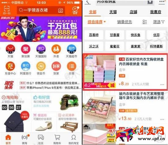 想要獲得流量,這里就不得不提:無線端直通車關鍵詞的質量得分直接影響寶貝是否有展現機會,和是否有機會在首屏的位置展現,左圖是手機淘寶APP,右圖是淘寶首屏的展示位置。