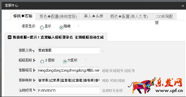 2、根據(jù)模板不同,出現(xiàn)的頁面會不大相同(圖示的比較復(fù)雜,客服頭像可以自己設(shè)定,不用系統(tǒng)默認(rèn)的),根據(jù)提示,把設(shè)置好的旺旺子賬號跟主賬號,分到售前、售后不同的欄目中,每個賬號用“|”隔開,對應(yīng)的客服昵稱,店長可以隨便起,也是用“|”隔開。