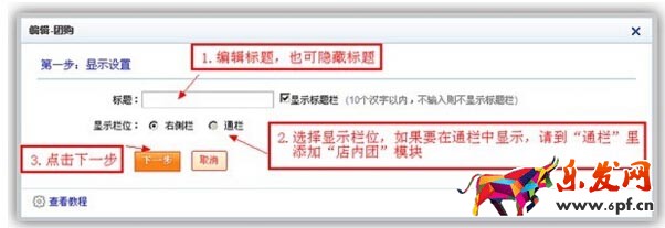 步驟二:編輯標(biāo)題,也可隱藏標(biāo)題,選擇顯示欄位(如果要在通欄中顯示,請到“通欄”里添加“店內(nèi)團(tuán)”模塊),然后再點(diǎn)擊下一步。