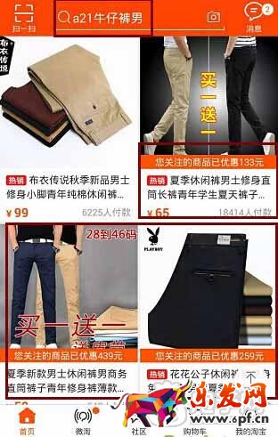 這個是手淘首頁的猜你喜歡,我們從上到下來看下個性化是多嚴重,首先搜索框推薦詞是a21牛仔褲男,而我最近就搜索了牛仔褲的關鍵詞(而且我搜這個詞的時候是在PC端搜的(登陸了賬號的))