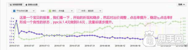 上圖是一個(gè)主要操作的寶貝路線圖,點(diǎn)擊率和平均扣費(fèi),在高度折線的地方,是排名出價(jià)提高位,然后曲線放緩,是步驟三,中間那一段是點(diǎn)擊率,最后,然后權(quán)重上來(lái)。