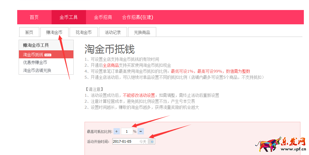 2、點擊立即運行活動,最高可抵扣比例是1%,活動開始日期設置成為今天-長期