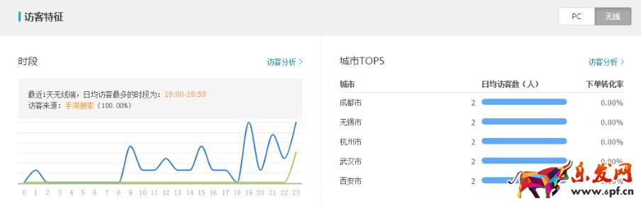 第二步直通車測款。首先我們打開生意參謀----經營分析----流量概況----訪客特征(付費功能不介紹,沒給我廣告費,哈哈),即使像下圖這么爛的新店還是還是能得到一些有效數據。比如訪客的訪問渠道主要是通過無線,訪問的時間主要是9-10,14-15,19-21點,訪客的地域主要集中在成都、無錫、杭州、武漢、西安。