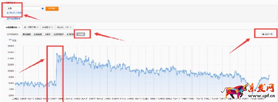 好了品類全了意味著臥室系列有啦,客廳系列有啦,餐廳系列有啦,書房系列也有啦。這個時候選一個合適的點切入,打開直通車流量解析輸入“家具”拉去一年的數據顯示如圖: