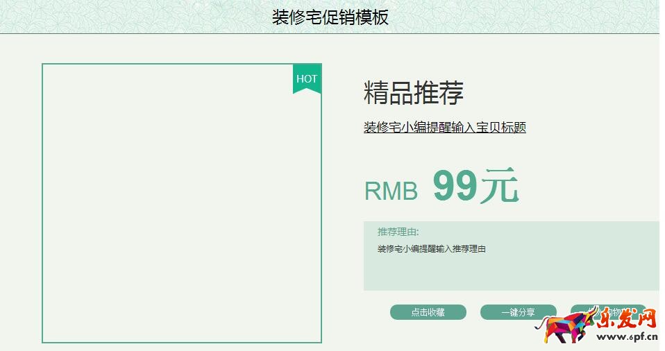 <div style="width:950px;height:auto; overflow:hidden;font-size:12px;background:#f2f5ee;"> <div class="sg-hd" style="overflow:hidden;zoom:1;margin-bottom:10px;font-family:微軟雅黑;"> <div style="overflow:hidden;height:50px;line-height:50px;background:#5ea591 url(https://img.alicdn.com/imgextra/i1/11193727/TB2J3TWdY0kpuFjy0FjXXcBbVXa-11193727.jpg) no-repeat center center;text-align:center;"> <span style="font-size:24px;overflow:hidden;color:#000;padding-left:2px;">促銷模板</span> </div> </div><div style="width:910px;background-color:#f2f5ee;font-family:Arial;overflow: hidden;padding: 20px;"> <ul> <li style=" width:910px;overflow: hidden;margin-bottom:20px;background-color: "> <div style=" float:left; width:400px;height:400px;border:2px solid #50ab91;"> <a style="width:400px;height:400px;text-decoration:none; display:block;background: url(小編提醒這里輸入寶貝圖片鏈接) no-repeat center center;" href="小編提醒這里輸入寶貝鏈接" target="_blank"> <span style="float:right;text-align:center;font-size:14px;line-height:40px;font-family:微軟雅黑;overflow:hidden;color:#fff;width:40px;height:42px;background:url(https://img.alicdn.com/imgextra/i3/11193727/TB2Z2Tbe.lnpuFjSZFjXXXTaVXa-11193727.png) center center no-repeat;">HOT</span> </a> </div> <div style="width:506px;height: 404px;float:left;;"> <span style=" margin:20px 0px 20px 60px;height:42px;line-height: 42px;display: block;font-size:36px;font-family:微軟雅黑;color:#323232;overflow: hidden">精品推薦</span> <a href="小編提醒這里輸入寶貝鏈接" target="_blank" style=" margin:20px 0px 20px 60px;height:42px;line-height: 20px;display: block;font-size:18px;font-family:微軟雅黑;color:#000;overflow: hidden">小編提醒輸入寶貝標題</a> <div style="height:64px;margin:20px 0px 20px 60px;line-height:64px;overflow: hidden;"> <span style=" font-size:36px;color: #50ab91">RMB <b style="font-size:60px;">小編提醒輸入寶貝價格</b> </span> </div> <div style=" margin:20px 0px 20px 60px;height:100px;font-family:微軟雅黑;color:#323232;overflow: hidden;background: #d8e9df;"> <div style=" margin:5px 20px;font-size:14px;color:#5ea591;overflow: hidden;height: 20px;line-height: 18px;">推薦理由:</div> <p style=" margin:5px 20px;height:60px;line-height:20px;overflow:hidden;">小編提醒輸入推薦理由</p> </div> <div style="margin:20px 0px 20px 60px;height:24px;overflow: hidden;text-align: center;"> <a href="小編提醒這里輸入寶貝鏈接&itemtype=1" target="_blank" style="float:left;margin: 0 20px 0 38px;text-decoration:none;display:block;overflow:hidden;width:110px;height: 22px;line-height:22px; border-radius: 10px;color:#FFF;background:#5ea591;">點擊收藏</a><div class="sns-widget" title="分享" style="cursor:pointer;float:left;margin: 0 20px 0 0;text-decoration:none;display:block;overflow:hidden;width:110px;height: 22px;line-height:22px; border-radius: 10px;color:#FFF;background:#5ea591;" data-sharebtn="{skinType:2,type:'item',key:'537053100191',comment:'小編提醒輸入寶貝標題',pic:'',client_id:68,isShowFriend:false}">一鍵分享</div> <a class="J_CartPluginTrigger" href="小編提醒這里輸入寶貝鏈接" target="_blank" style="float:left;text-decoration:none;display:block;overflow:hidden;width:110px;height: 22px;line-height:22px; border-radius: 10px;color:#FFF;background:#5ea591;">加入購物車</a> </div> </div> </li> <li style=" width:910px;overflow: hidden;margin-bottom:0px;background-color: "> <div style=" float: right; width:400px;height:400px;border:2px solid #50ab91;"> <a style="width:400px;height:400px;text-decoration:none; display:block;background: url(小編提醒這里輸入寶貝圖片鏈接) no-repeat center center;" href="小編提醒這里輸入寶貝鏈接" target="_blank"> <span style="float:right;text-align:center;font-size:14px;line-height:40px;font-family:微軟雅黑;overflow:hidden;color:#fff;width:40px;height:42px;background:url(https://img.alicdn.com/imgextra/i3/11193727/TB2Z2Tbe.lnpuFjSZFjXXXTaVXa-11193727.png) center center no-repeat;">HOT</span> </a> </div> <div style="width:506px;height: 404px;float: right;;"> <span style=" margin:20px 60px 20px 0px;height:42px;line-height: 42px;display: block;font-size:36px;font-family:微軟雅黑;color:#323232;overflow: hidden">精品推薦</span> <a href="小編提醒這里輸入寶貝鏈接" target="_blank" style=" margin:20px 60px 20px 0px;height:42px;line-height: 20px;display: block;font-size:18px;font-family:微軟雅黑;color:#000;overflow: hidden">小編提醒輸入寶貝標題</a> <div style="height:64px;margin:20px 60px 20px 0px;line-height:64px;overflow: hidden;"> <span style=" font-size:36px;color: #50ab91">RMB <b style="font-size:60px;">小編提醒輸入寶貝價格</b> </span> </div> <div style=" margin:20px 60px 20px 0px;height:100px;font-family:微軟雅黑;color:#323232;overflow: hidden;background: #d8e9df;"> <div style=" margin:5px 20px;font-size:14px;color:#5ea591;overflow: hidden;height: 20px;line-height: 18px;">推薦理由:</div> <p style=" margin:5px 20px;height:60px;line-height:20px;overflow:hidden;">小編提醒輸入推薦理由</p> </div> <div style="margin:20px 60px 20px 0px;height:24px;overflow: hidden;text-align: center;"> <a href="小編提醒這里輸入寶貝鏈接&itemtype=1" target="_blank" style="float:left;margin: 0 20px 0 38px;text-decoration:none;display:block;overflow:hidden;width:110px;height: 22px;line-height:22px; border-radius: 10px;color:#FFF;background:#5ea591;">點擊收藏</a><div class="sns-widget" title="分享" style="cursor:pointer;float:left;margin: 0 20px 0 0;text-decoration:none;display:block;overflow:hidden;width:110px;height: 22px;line-height:22px; border-radius: 10px;color:#FFF;background:#5ea591;" data-sharebtn="{skinType:2,type:'item',key:'544532910420',comment:'小編提醒輸入寶貝標題',pic:'',client_id:68,isShowFriend:false}">一鍵分享</div> <a class="J_CartPluginTrigger" href="小編提醒這里輸入寶貝鏈接" target="_blan