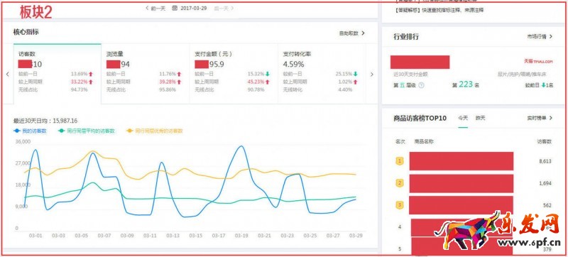 從板塊1里還能看到今天和昨天銷售數據的實時對比、無線數據占比以及行業實時排名,方便我們靈活調整運營策略。訪客少了我們就尋找訪客少的原因,金額少了就尋找金額減少的原因,瀏覽少就尋找瀏覽量減少的原因,通過數據可以嚴密監控店鋪異常。