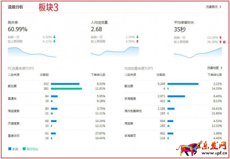 板塊3顯示的是前一日的流量概況,上面顯示的是跳失率、人均瀏覽量和平均停留時長以及與前一日和上周同期的數據對比,下面顯示的是PC端和無線端的流量來源以及與同行的對比。