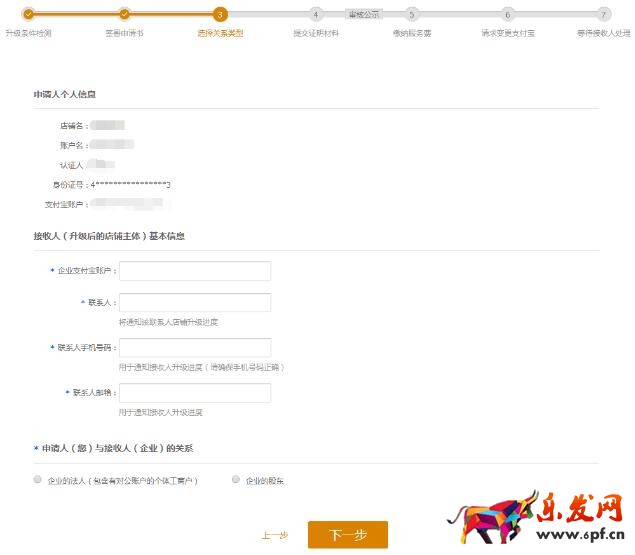 現在開始選擇關系類型,先是申請人的個人信息,然后填寫接收人(升級后的店鋪主體)基本信息,填上企業支付寶賬戶,還有聯系人及其手機號碼跟郵箱,最好選擇申請人跟接收人(也就是企業)的關系,然后進入下一步。