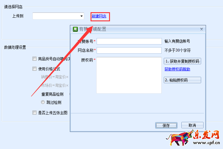5.數據處理設置,第一次使用的小伙伴在這邊選擇新建網店,輸入你的有贊賬號和密碼獲取授權碼。