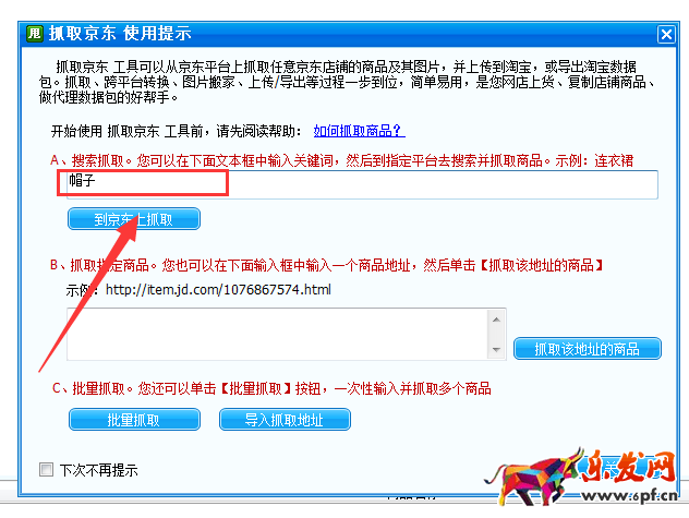2.抓取京東,使用提示,根據提示進行商品抓取,可以批量抓取,這邊我們先選擇搜素抓取。