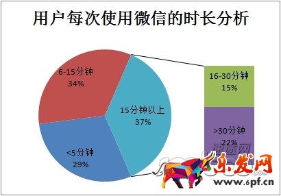 用戶每次使用微信的時長看,小于15分鐘的占大多數,其中29%的用戶使用微信時長小于5分鐘,34%的用戶使用時長在6-15分鐘。只有37%用戶使用時長在15分鐘以上。因而微信還需要提高用戶的粘性,進一步增加微信的吸引力。lwvS}:e.W6E~