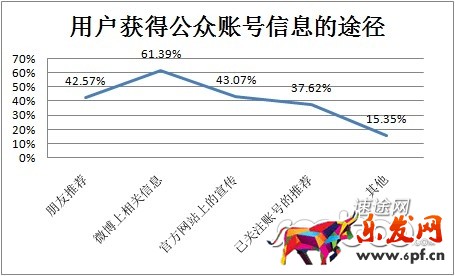那么,用戶又是通過什么渠道獲得自己關注的公眾帳號的信息呢?從上面圖表中看到,42.57%的用戶通過朋友推薦獲得了某些公眾賬號的信息,61.39%的用戶通過微博上推送的消息了解到某公眾帳號的信息;也有43.07%的用戶通過官方網站上宣傳得到公眾賬號的信息,P&p{9ib*lK8xh\