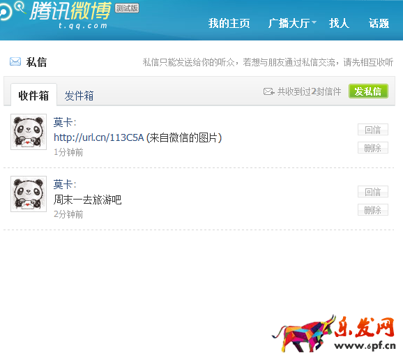 1、回復的私信,會發送到好友微博的私信中去。 Kg'JV!i|G.q*a(v