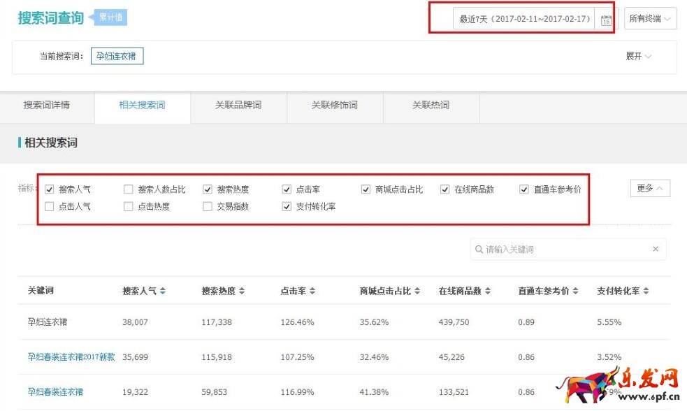 打開市場行情找到搜索詞查詢,搜索孕婦連衣裙,選擇最近7天數據找到以下關鍵詞:孕婦春裝連衣裙、2017新款、韓版、孕婦A字連衣裙等關鍵詞