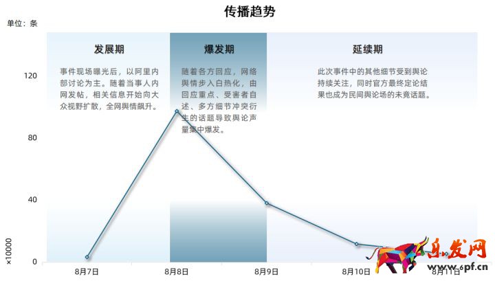 阿里女員工被侵害事件(完整分析報告→),輿情爆發速度較快,輿情長尾明顯。從發酵特點來看,輿情發展前期,諸如“阿里女員工食堂維權”“阿里女員工自曝被侵害”等信息僅在阿里職場圈內傳播,傳播范圍相對較窄。當事人內網發帖后,相關信息被部分網民轉載至脈脈、社交媒體等平臺,逐步向大眾視野擴散,在社交媒體大V、各大媒體的推波助瀾下,輿情全面升溫,進入爆發期。此時段內,各方回應、事件細節的沖突導致民間輿論場集體沸騰,阿里、華聯等涉事主體面臨的輿情壓力大增。8月9日,隨著阿里、華聯初步處置措施的公布,輿情熱度開始有所減退,公眾注意力開始向其他細節轉移,“酒店管理漏洞”“涉事人曲一動向”等成為輿論后續討論的重要線索。